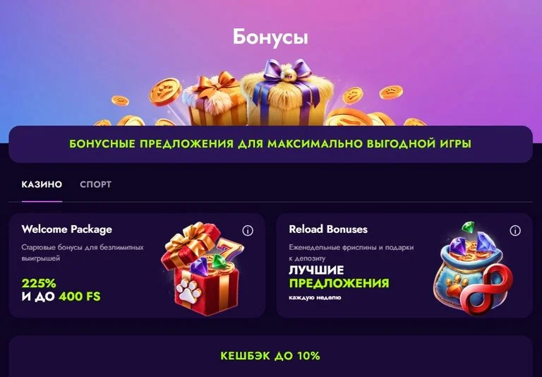 Для новых пользователей предусмотрен приветственный бонус до 225% + 400 фриспинов, который можно использовать в популярных слотах. Постоянным пользовательам доступны кэшбэк, акции и программа лояльности.