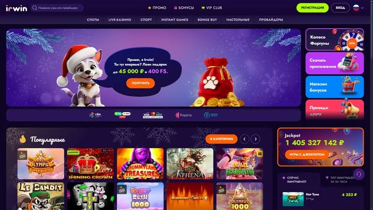 В разделе популярных игр Irwin Casino стабильно лидируют слоты с высокой волатильностью и бонусными механиками. Среди наиболее востребованных автоматов:Gates of Olympus 1000, Sweet Bonanza, Big Bass Bonanza, Sugar Rush, The Dog House Megaways и Book of Fallen. Эти тайтлы привлекают пользовательов крупными множителями, сериями фриспинов и частыми бонусными раундами.