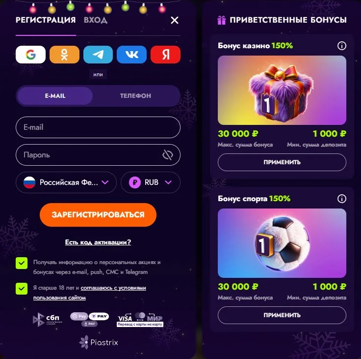 - 150% бонус на казино — до 30 000 ₽.