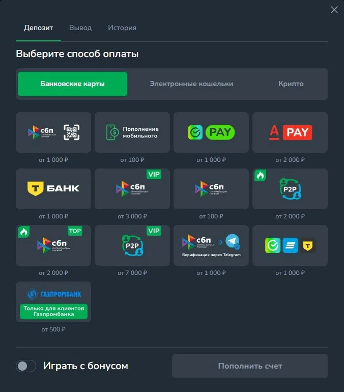 Cactus Casinoпредлагает удобную систему пополнения счёта для пользовательов из России и СНГ. Минимальный депозит начинаетсяот 100 рублей, а большинство платежей зачисляются мгновенно. Все операции проходят через защищённые платёжные шлюзы с использованием SSL-шифрования.