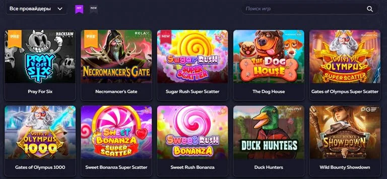 В лобби есть удобная сортировка и категории по провайдерам(фильтр «Все провайдеры»), а также быстрый поиск по названию игры. Это помогает быстро находить привычные автоматы и смотреть новинки конкретных студий без лишних кликов.