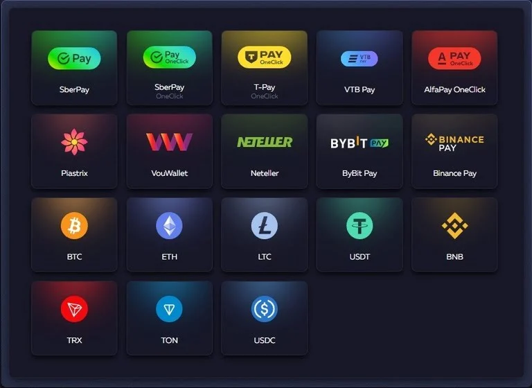 - Криптовалюта(USDT, BTC, ETH, LTC, BNB, TRX, TON, USDC и др.) — для тех, кому удобнее цифровые активы.