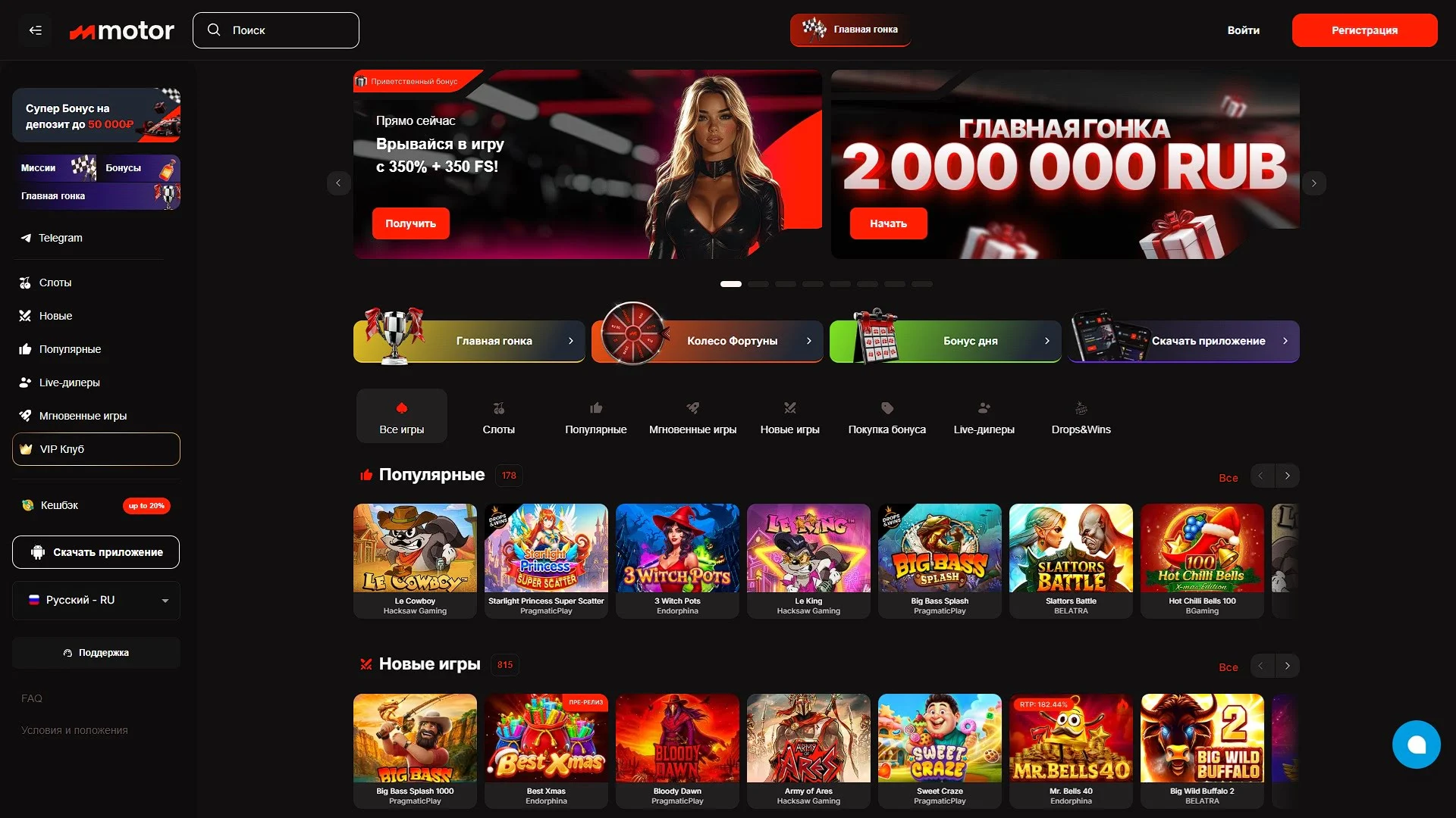 Motor Casino: пакет приветственных бонусов до 350% + 350 FS на серию депозитов, кэшбэк до 20% и 6000+ слотов с live-дилерами и мини-играми в каталоге.