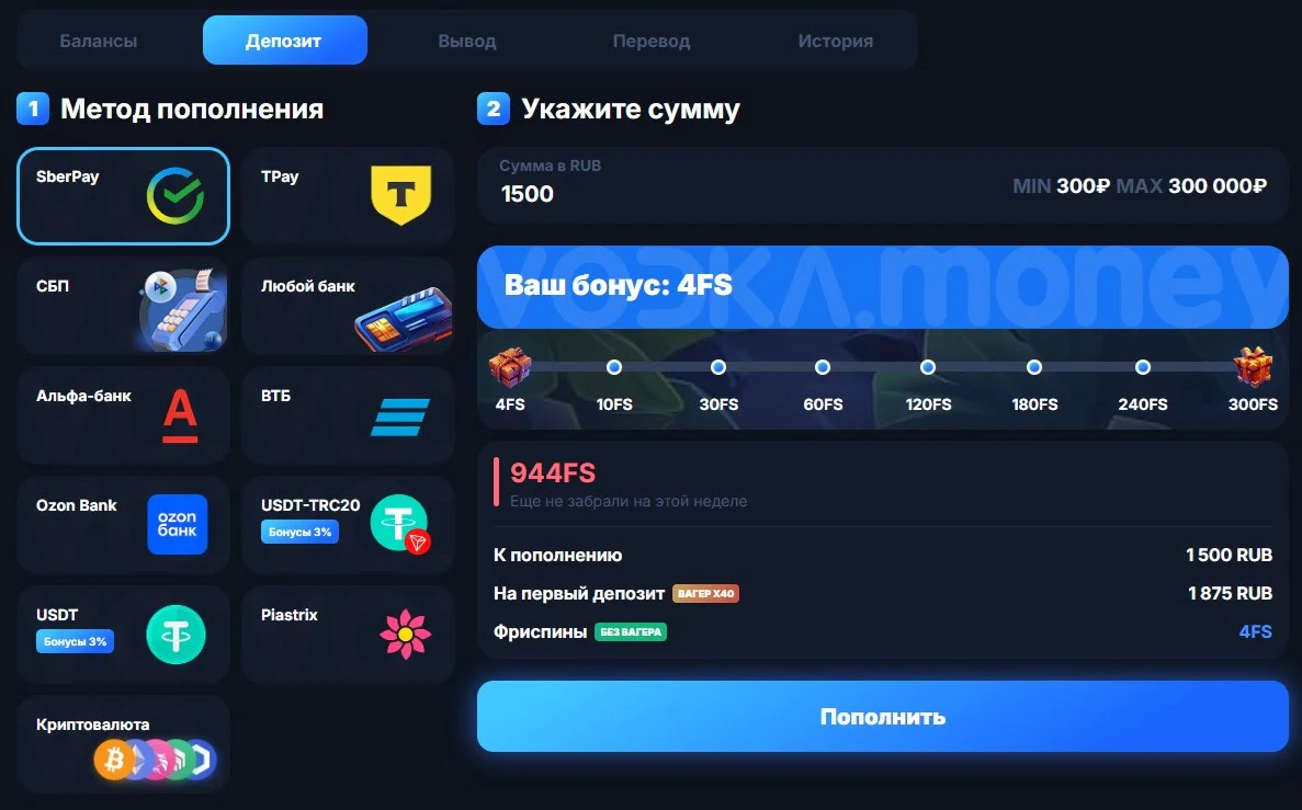 Онлайн-казино Водкаподдерживает удобные и популярные способы пополнения, включая банки, СБП, электронные кошельки и криптовалюту. Интерфейс депозита интуитивно понятный: вы выбираете метод, указываете сумму и сразу видите, какой бонус или количество фриспинов получите за пополнение.